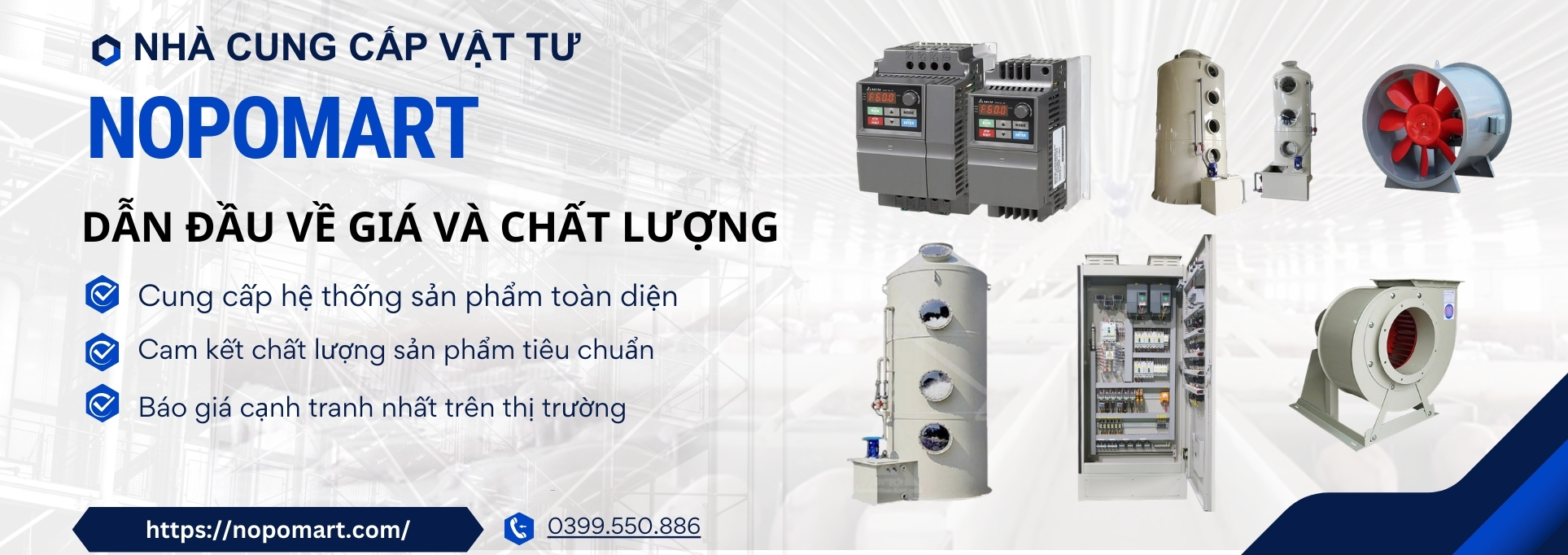 NOPOMART chuyên cung cấp thiết bị và vật tư công nghiệp: thiết bị lọc bụi, vật tư tháp hấp phụ và hấp thụ, quạt công nghiệp, thiết bị điện, năng lượng và giải pháp kỹ thuật đi kèm.