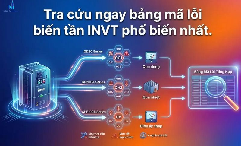 Bảng mã lỗi biến tần invt là tài liệu kỹ thuật quan trọng giúp người vận hành tại NOPOMART nhanh chóng xác định sự cố của bộ điều khiển động cơ. Việc nắm vững danh sách cảnh báo và giải pháp sửa chữa giúp duy trì hệ thống điện ổn định và tăng năng suất lao động cho mọi nhà máy sản xuất.