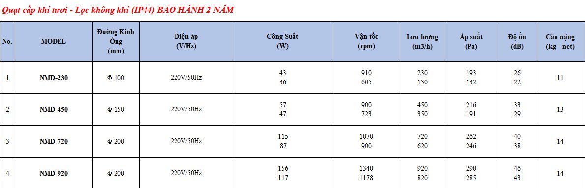 Dưới đây là bảng thông số kỹ thuật chi tiết cho các model quạt cấp khí tươi, lọc không khí IP44: