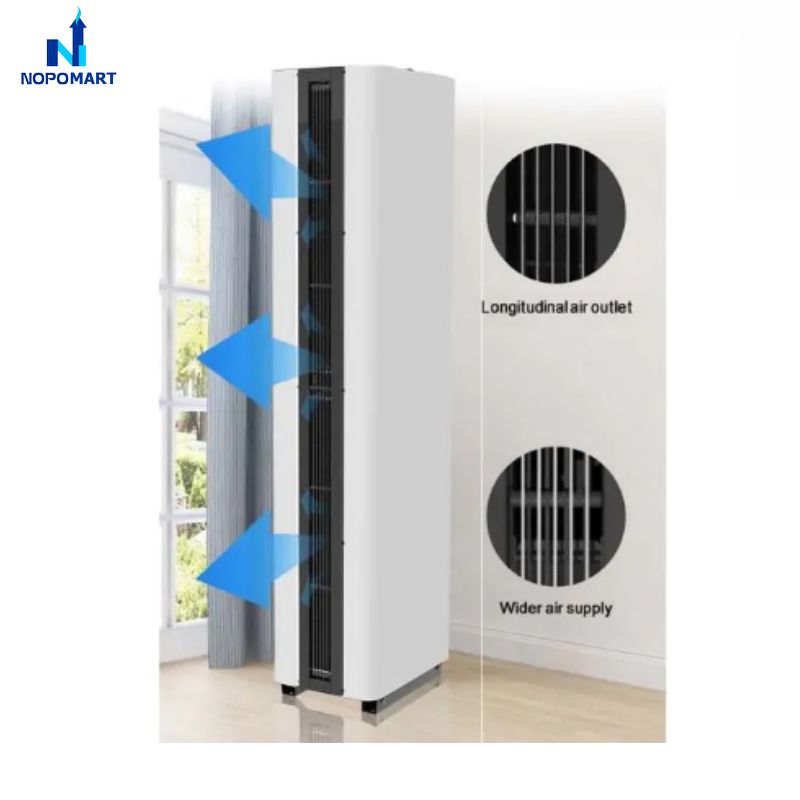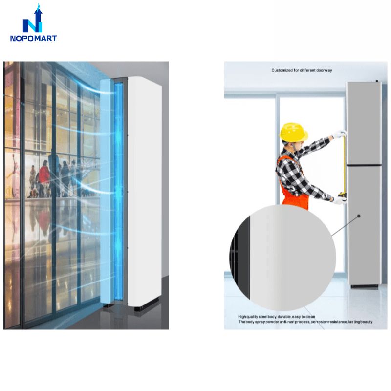 Đối với các loại cửa có trần quá cao hoặc kết cấu trần thạch cao yếu, việc treo một bộ quạt cắt gió nặng hàng chục kg là vô cùng mạo hiểm. Thiết bị dạng đứng tại NOPOMART được thiết kế để đặt trực tiếp trên sàn hoặc gắn chặt vào vách tường bên cạnh cửa. Điều này không chỉ giải quyết vấn đề về tải trọng trần mà còn mang lại tính thẩm mỹ cao, giúp thiết bị hòa nhập hoàn hảo vào kiến trúc của tòa nhà mà không gây cảm giác nặng nề ở phía trên lối đi.