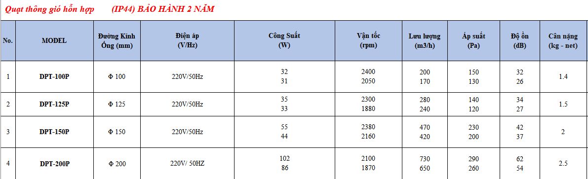 Dưới đây là bảng báo giá chi tiết cho các model quạt thông gió hỗn hợp Nanyoo DPT để khách hàng tham khảo: